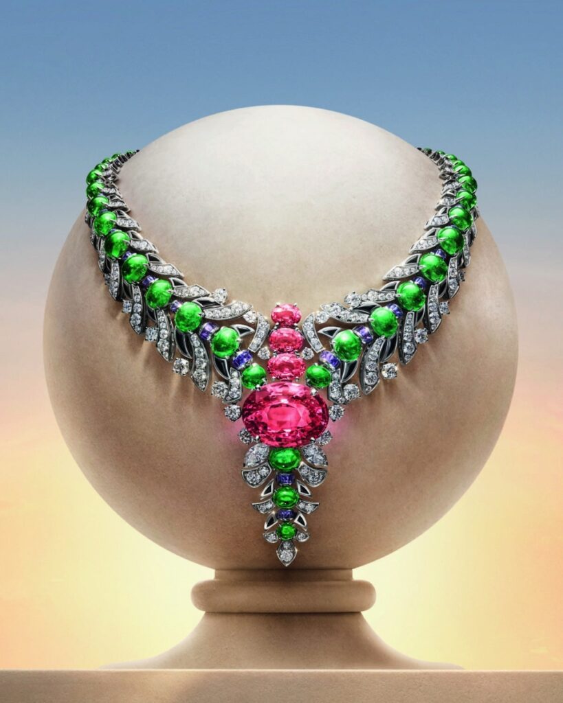 The Secret Garden necklace features a rare 26.65-carat Padparadscha sapphire, evoking Rome’s hidden courtyards. The Eclettica Secret Garden High Jewellery necklace by Bvlgari is centred on a rare 26.65-carat Padparadscha sapphire from Sri Lanka, its unique hue evoking the warmth of Roman gardens at sunset. The composition unfolds around the gemstone, with sapphires, emeralds, onyx, and diamonds arranged in precise geometric contrasts to enhance its colour and radiance. Every element is meticulously calibrated, resulting in a harmonious balance of light, structure, and vivid chromatic expression.