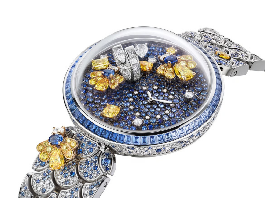 Set with 8.33 carats of white diamonds, 2.04 carats of yellow diamonds, and 7.60 carats of blue sapphires, Notte Stellata Diva watch houses the Piccolissimo manufacture manual-winding mechanical micro movement, just 2.5mm thin, with a 30-hour power reserve and a frequency of 21,600 Vph (3Hz).