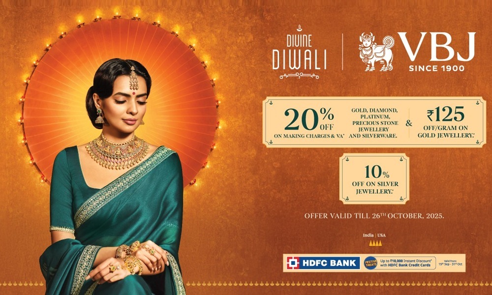 This Diwali, VBJ invites patrons to illuminate their celebrations with timeless creations that unite tradition and innovation. As part of the Divine Diwali celebration, customers can enjoy 20% off on making charges and VA across gold, diamond, platinum, precious stone jewellery and silverware. Additionally, VBJ offers Rs. 125 off per gram on gold jewellery and 10% off on making charges and VA on silver jewellery, valid from 4th October to 26th October 2025. Festive shoppers can also enjoy instant discounts up to Rs. 10,000 on HDFC Bank Credit Cards.