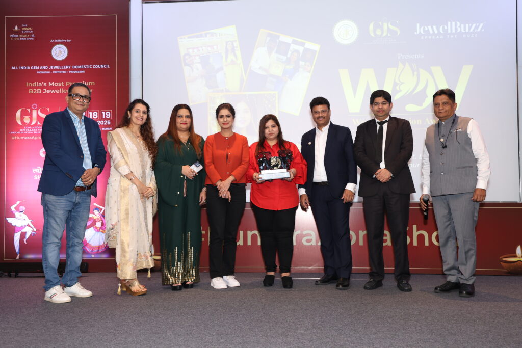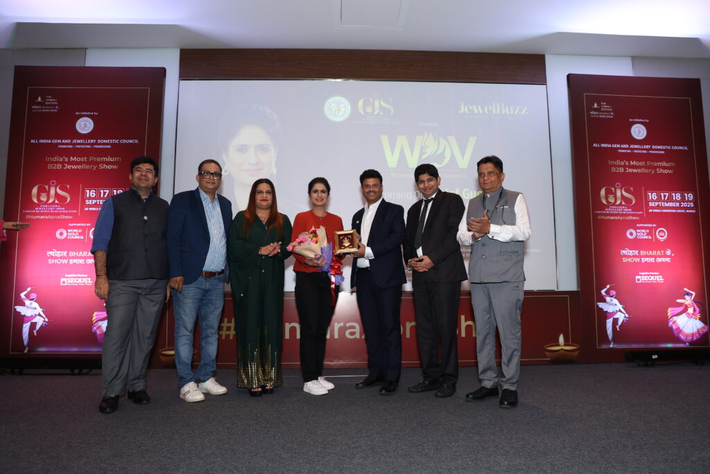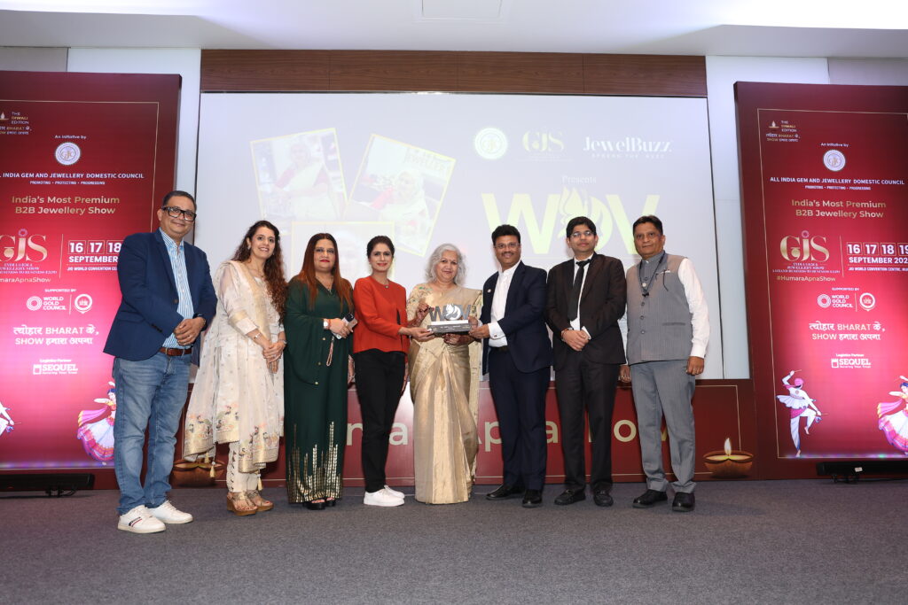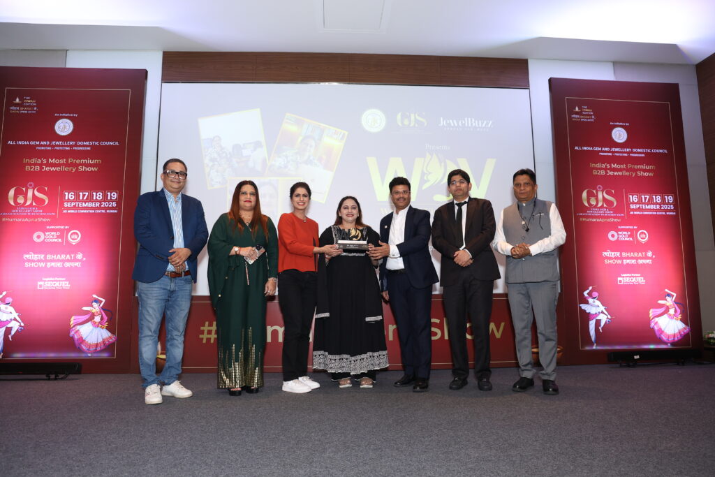 The Chief Guest Manisha Gupta, Commodities Editor -at CNBC-TV18 presented the awards to the worthy winners along with Rajesh Rokde, Chairman GJC, Avinash Gupta, Vice Chairman GJC, Saiyam Mehra, IPC- GJC and Convenor GJS, Nitin Khandelwal, Past Chairman, GJC, Vivek Kabra, Founder and Publisher- JewelBuzz, Ashika Kabra, Co-Founder, JewelBuzz.