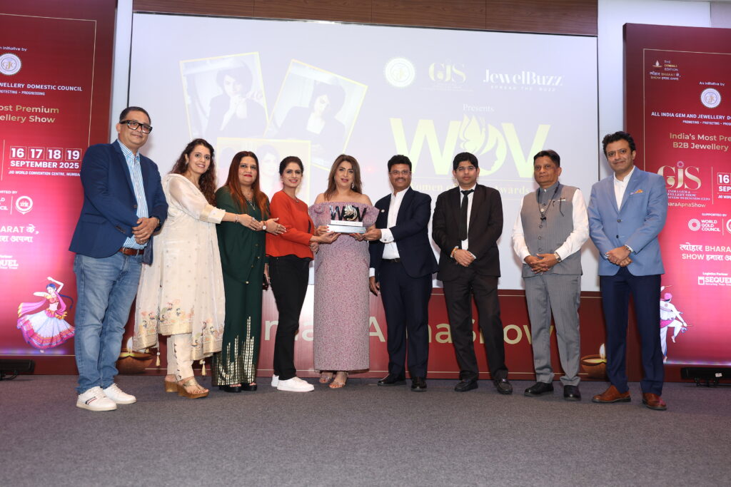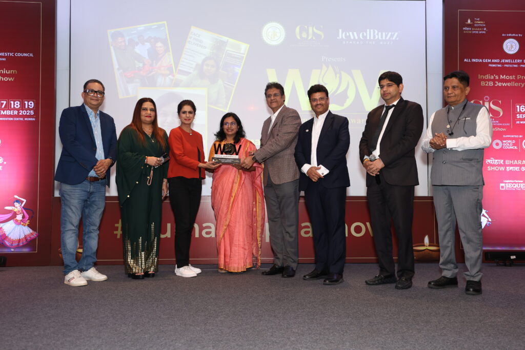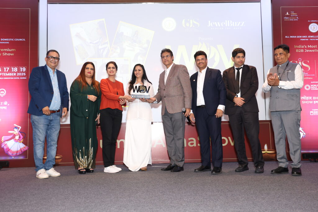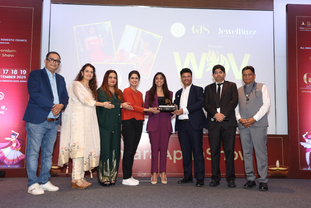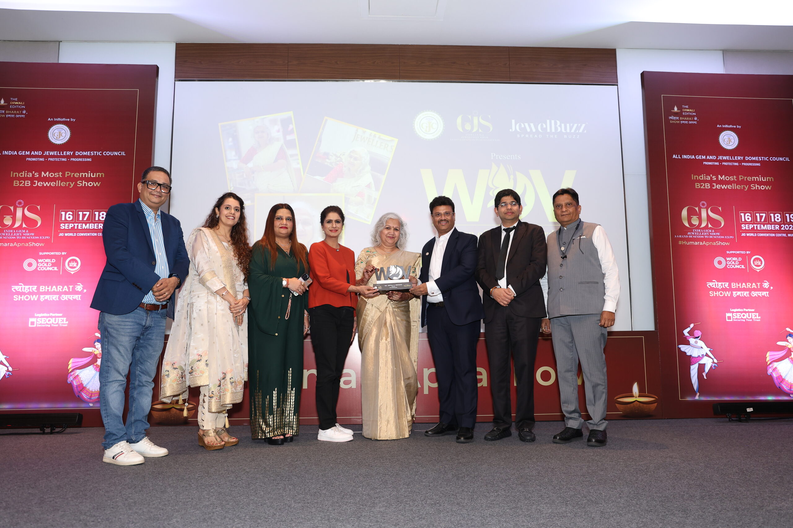 The Chief Guest Manisha Gupta, Commodities Editor -at CNBC-TV18 presented the awards to the worthy winners along with Rajesh Rokde, Chairman GJC, Avinash Gupta, Vice Chairman GJC, Saiyam Mehra, IPC- GJC and Convenor GJS, Nitin Khandelwal, Past Chairman, GJC, Vivek Kabra, Founder and Publisher- JewelBuzz, Ashika Kabra, Co-Founder, JewelBuzz.