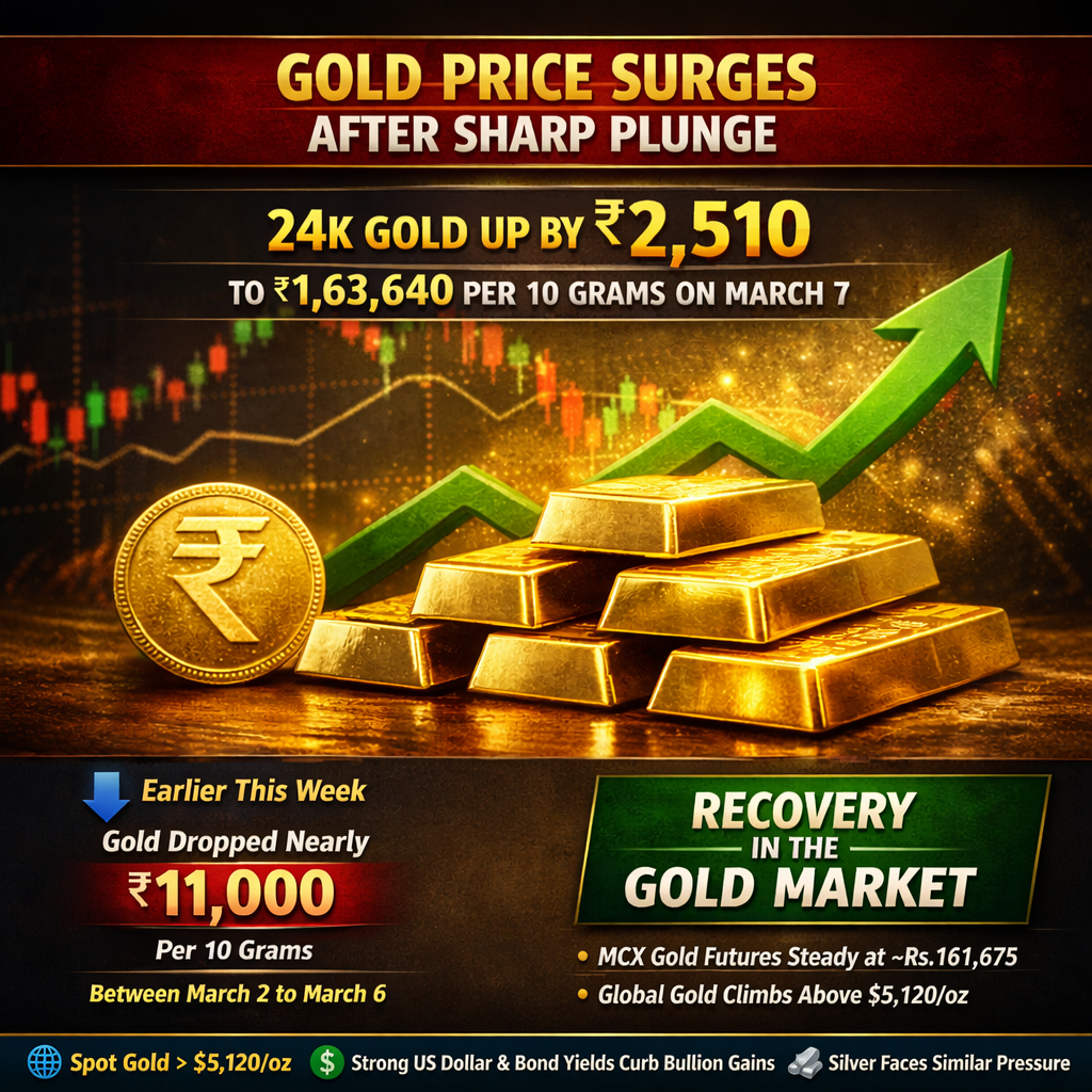The price of 24-karat gold rose by Rs. 2,510 per 10 grams to Rs.163,640 on March 7, according to market data. The recovery comes after bullion prices fell steeply earlier in the week, with gold dropping nearly Rs.11,000 per 10 grams—or about Rs.110,000 per 100 grams—between March 2 and March 6.