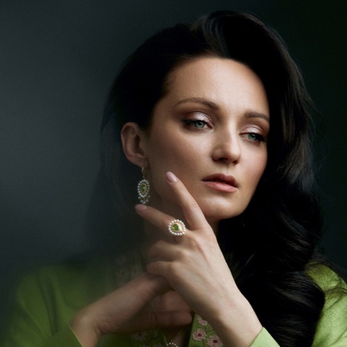 The design concept centers on love and tenderness — reflected in the color palette of gemstones and the airy forms of the jewelry, adorned with delicate arabesques.